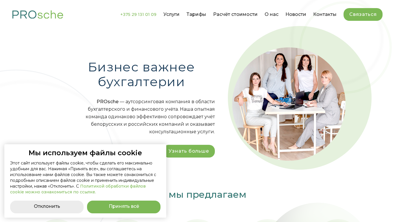 | SEO-описание | Ведение бухгалтерского учета и услуги бухгалтера в Минске для ООО, предприятий и организаций: бухуслуги в РБ по доступным ценам от компании PROsche. О… |