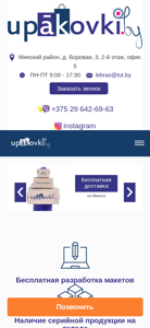 | AI-анализ | The website upakovki.by is an online store specializing in the sale of packaging materials and packaging in Minsk, Belarus. The company offers a wide range of packaging options, including plastic bags, craft paper bags, zip-lock bags, labels, and adhesive tapes. Prices are competitive and the company offers both wholesale and delivery services throughout Belarus. Customers can contact the company via phone or email to place orders. The website also features an Instagram account and a map with a location in the Minsk region. The company boasts a quick turnaround time for orders, with the possibility of completing projects in just three days. Additionally, customers can benefit from free design mockups during the consultation phase. The website is user-friendly, with clear product categories and easy-to-find contact information. |