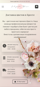 | AI-анализ | --- This online resource is a florist shop in Brest, Belarus, offering flower delivery and online sales. Customers can purchase bouquets and flowers in Brest with free delivery, and at competitive prices. The website provides a catalog of various bouquets, including those made of roses, tulips, chrysanthemums, and other seasonal flowers. Users can place orders online, over the phone, or in person at the store. The shop's business hours are from 8:00 to 20:00 every day for order placement, and from 8:30 to 20:00 for delivery. The website also features a blog. |