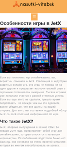| AI-анализ | This website is about the game JetX and its unique features. It is a casino gaming website, with the title "Особенности игры в JetX" and a description that mentions JetX being a revolutionary game in the online casino industry that offers an exclusive experience with a huge winning potential. The website provides a detailed overview of the game, explaining that JetX, released in January 2019, is a crash game where a plane (or jet plane) takes off and gradually ascends in altitude until it explodes in mid-air. The objective of the game is to exit before the plane explodes to receive a reward based on the level at which you exit. The website also mentions the simplicity of the game mechanism as a contributing factor to its success. The interface for playing JetX is also described as simple to use. |