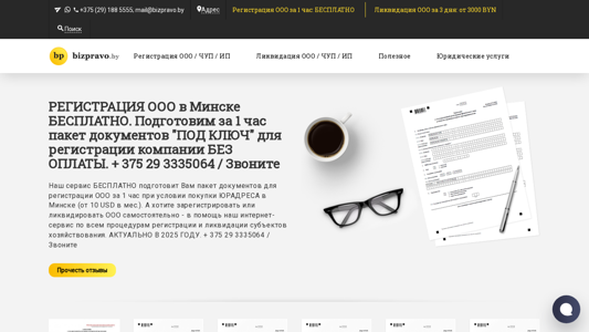 | AI-анализ | The website Bizpravo.by provides information and services related to business registration in Minsk and Belarus, including Individual Entrepreneurship (IP), Limited Liability Companies (LLC), and other forms of property. The site offers all necessary information for a straightforward and easy business launch. Services include registration of LLCs for free within an hour and LLC liquidation starting from BYN 3000. Users can find information on registering and liquidating LLCs, partnerships, and individual entrepreneurships. The site also provides instructions, templates, and examples of required documents. Additionally, it offers services for foreigners, such as temporary residence permits and work permits. Services for registering and liquidating businesses "under key" are also available for a fee. |