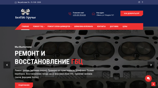 | AI-анализ | --- The web project "БелГБЦ-Уручье" offers complex repair and restoration services for GBC (Gasoline and Diesel engines) in Minsk, Belarus. They use German equipment for efficient and guaranteed results. Customers can expect quick turnaround times and a 100% guarantee. Delivery is available with a call center open Monday to Friday, 9:00 AM to 8:00 PM. The main services include engine block checking, cylinder block shaving, valve adjustment, and more. Additionally, they provide repair for radiators and engine mounts. The website features detailed information on their services and offers a contact form for inquiries. |
