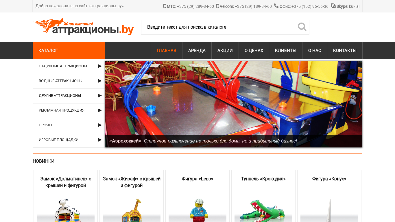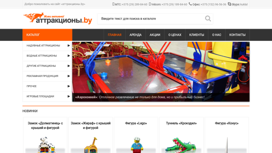 | AI-анализ | --- The portal attrakcyony.by is an online catalog for inflatable attractions, including bouncy castles, water slides, and other recreational equipment. The site offers various sizes and versions of these items, suitable for both indoor and outdoor use. Some featured products include a castle named "Dolmatinec" with a size of 7.2 x 6.2 meters, made from self-cleaning, durable, and reinforced material for use in covered parks. Another product is the "Jiraf" castle with a size of 6.2 x 5.2 meters, also made from the same self-cleaning, durable, and reinforced material. The site also offers a "Lego" figure that is 5 meters long, as well as a "Krokoil" tunnel with dimensions of 10.9 x 6.8 x 2.4 |