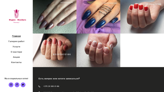 | SEO-лексика | магия маникюра женский мужской маникюр главная галерея работ услуги мастере акции контакты социальных сетях есть вопрос хотите записаться 375 383-51-86 |
