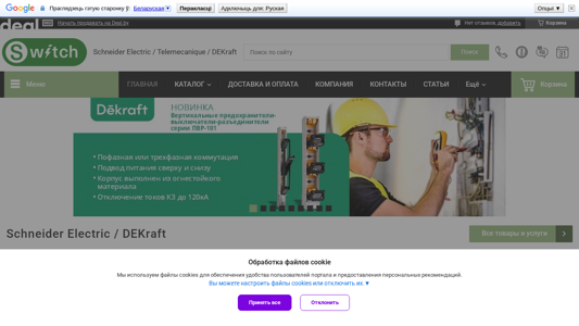 | AI-анализ | The web project "НЭТКОМ Schneider Electric DEKraft" offers contacts, products, and services of Schneider Electric DEKraft company, including electric equipment, modules, electrical cabinets, measuring instruments, compensation devices, frequency converters, lighting technology, and final switches. The company also provides climate systems DEKraft (ventilators, heating elements, thermostats). The website features a catalog with various Schneider Electric products, contact information, and delivery and payment options. The page includes a shopping cart and a menu for browsing different types of equipment. The company's contact information is provided, as well as articles and a photo gallery. The website is available at netkom.by. |