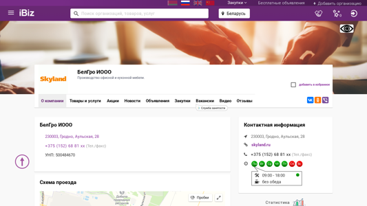 | AI-анализ | This website is for BelGro IOOO, a manufacturing company based in Grodno, Belarus. They produce both office and kitchen furniture. The website includes a map with directions, contact information, and the company's UNP number. The company operates from Monday to Friday, from 9am to 6pm without lunch breaks. The website also features a catalog of their products and services, as well as contact information for their customer service. The domain is registered under the .by extension for Belarus, and the website is hosted on the iBiz platform. The site is categorized under the 'Furniture' section, specifically for 'Furniture in Grodno'. |