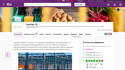 | AI-анализ | The web project "Kartberg CHP" is a manufacturing company based in Grodno, Belarus, located at Kosmonavtov Prospekt 100. Specializing in agricultural technology and processing of agricultural produce, Kartberg CHP was established in 2013 and has since gained a reputation as a reliable partner in the agrarian sector, providing quality and technologically advanced solutions. The company's product range includes cold-pressed oil presses for sunflower, rapeseed, and other seeds; carrot-sorting lines and equipment for vegetable calibration; washing, cleaning machines, and product delivery systems; containers for vegetable storage, including self-opening ones; and custom-made metal structures, such as frames, farms, and shelving. Quality, reliability, and individual approach are the company's top priorities. Kartberg CHP offers more |