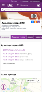 | AI-анализ | This website is an e-commerce platform for Agro Services OAO, offering spare parts for agricultural machinery, specialty petroleum products, and transportation of hazardous goods in Belarus. The address and contact information, including phone numbers for the reception, dispatcher, and supplies department, are provided. The company's Unified State Register number is 500030541. The website includes a map for navigating the location, business hours, and a rating system for customers to leave feedback. The domain is registered under the .BY top-level domain and is associated with the iBiz search engine. |