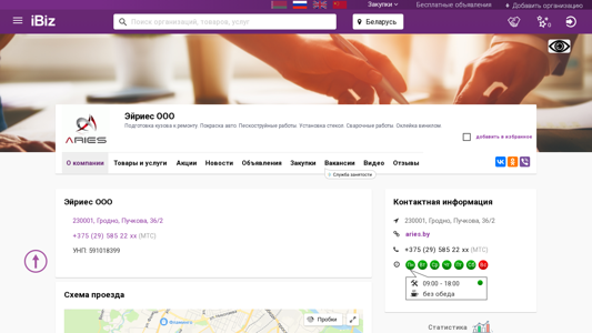 AI-анализ | This online resource is dedicated to the automobile repair services provided by the company Eyries OOO. The website offers various automobile repair and maintenance services including body preparation for repair, painting, sandblasting, glass installation, welding, and vinyl wrapping. The company is located in Grodno, Belarus, specifically at 230001, Puchkovy 36/2. The contact information for the company includes the phone number +375 (29) 585 22 xx (MTS). The business hours are Monday through Friday from 9:00 AM to 6:00 PM, with a break for lunch. The company falls under the category of auto services and repair in Grodno. |