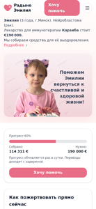 | AI-анализ | This online resource is a fundraising platform for Emilia Radino, a three-year-old girl from Minsk, Belarus, who is diagnosed with neuroblastoma, a form of cancer in its fourth stage. The website aims to collect €190,000 for her treatment, which involves immunotherapy using a medication called Карзиба. The progress of the fundraising effort is displayed, with €114,311 raised as of the current date, leaving €75,689 to be collected. Various payment methods are accepted, including MTS, Belarusbank, Sber, Paysend, and Bybit. Donors can contact the fundraising organizers via phone, Viber, Telegram, Instagram, and TikTok. The website provides documentation, such as a prescription for the medication and a medical record from the National Research Center for Pediatric |