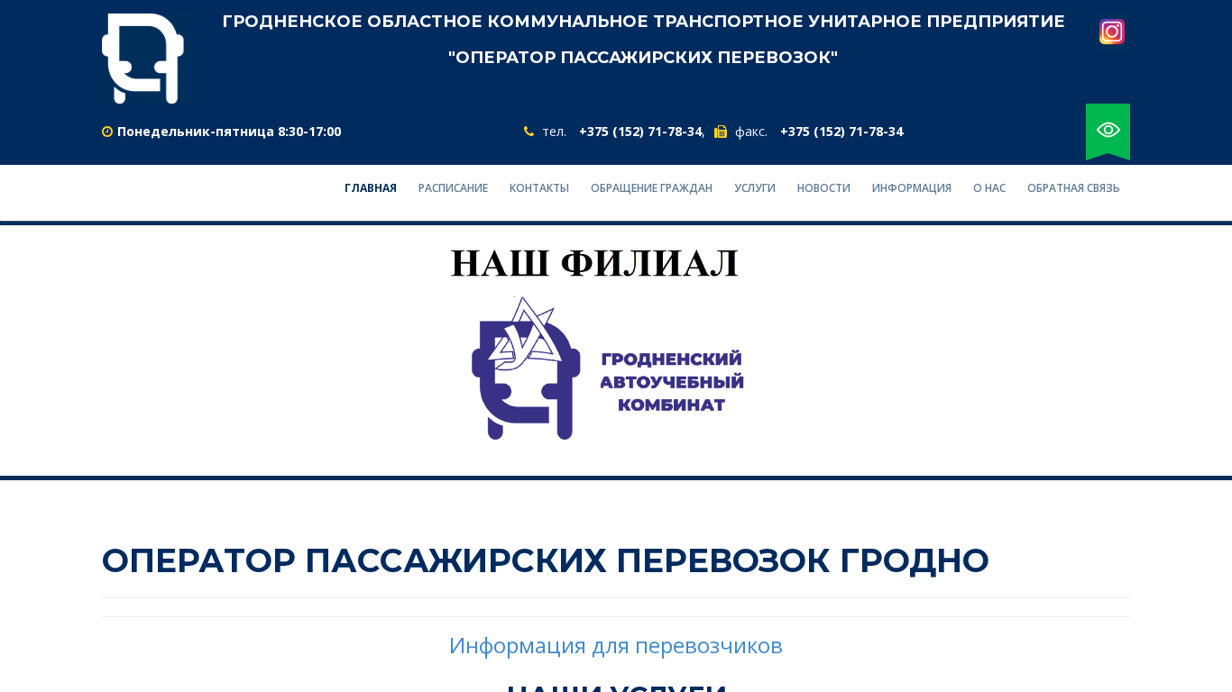 | Ключевые слова | Оператор Гродно пассажирские перевозоки Гродненский областной оператор пассажиских перевозок расписание пассажирского транспорта grodnoobloperator.by grodnopasstrans grodnopastrans |