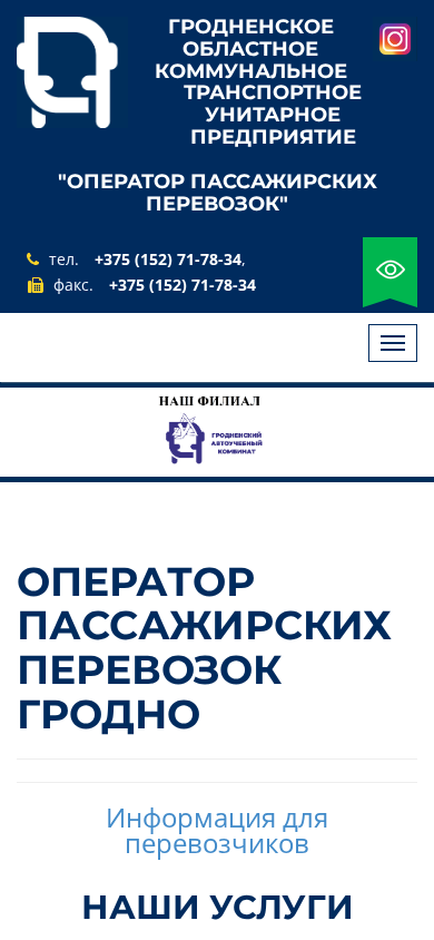 | AI-анализ | The web project "Operator of Passenger Transport Services in Grodno" is an official website for a state-owned enterprise named "Operator of Passenger Transport Services" located in Grodno, Belarus. The website offers information on the company's services, contacts, and news. The main topics of the site are passenger transport services, schedules, and contacts. The site includes sections for the company's contacts, passenger services, and news. Keywords related to the project include "Operator Grodno," "passenger transport services," "Grodno Regional Operator of Passenger Transport," "schedule of passenger transport," and "Grodno Passenger Transport." The site also includes information on services for transport companies, such as issuing temporary permits, making changes to route passes, and organizing and conducting competitions for the right to perform passenger transport services. The site is available from Monday to Friday, 8 |
