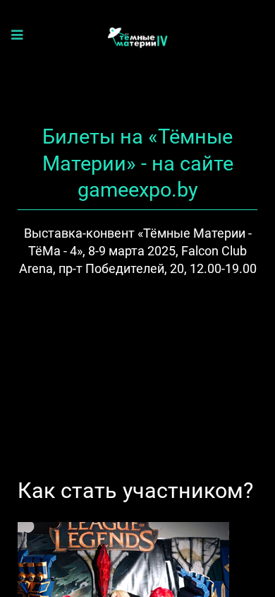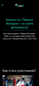 | Адрес | сайте gameexpo.by, Выставка-конвент «Тёмные Материи - ТёМа - 4», 8-9 марта 2025, Falcon Club Arena, пр-т Победителей, 20 |