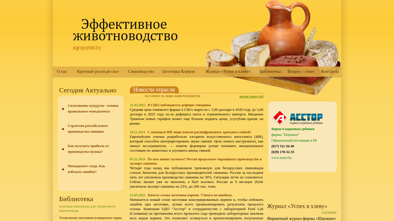 | AI-анализ | --- The web project Agroportal is an informational portal dedicated to livestock farming. It provides information on norms and rations for feeding all categories of cattle and pigs, as well as recommendations for their care. The website covers topics related to feed, feed additives, and premixes for cow and pig farming. Keywords associated with the project include agroportal, livestock feeding, livestock farming, cattle, dairy farming, pig farming, feed additives, premixes, and biological conservant. The most frequently occurring words on the site are 'corms', 'journal', 'livestock', 'livestock farming', 'cattle', 'pigs', 'rations', 'recommendations', and 'feed'. The site includes sections on silage making from corn, strategies for profitable swine production, and methods for making a profit from dairy farming. |