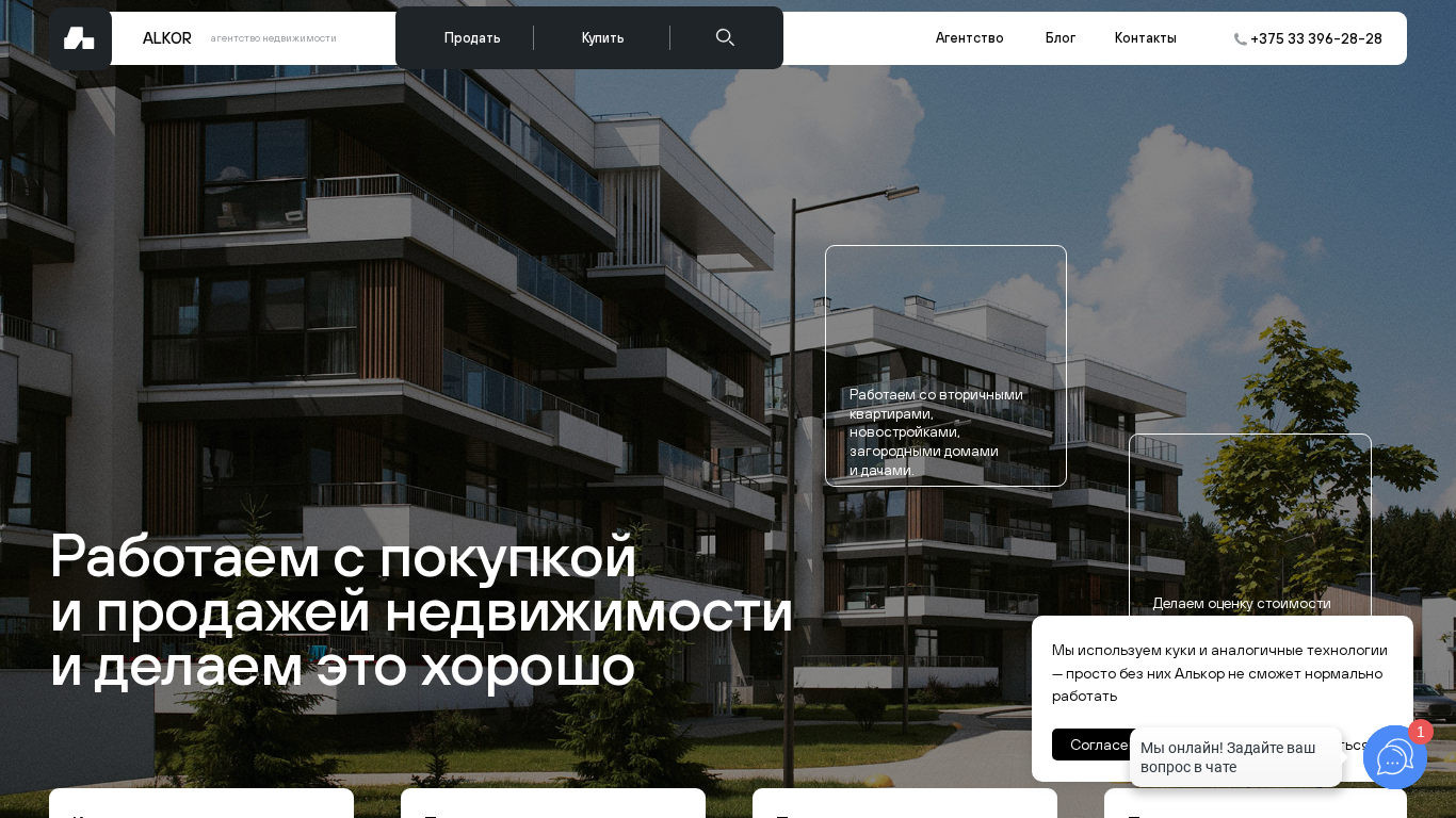 The website "Alkor — агентство недвижимости в Минске" (Alkor Realty) is a real estate agency based in Minsk, Belarus. The main content of the site focuses on selling and buying apartments and houses. Users can contact the agency via phone number "+375 33 396-28-28" for consultations. The site includes a blog, contact information, and a catalog of properties for sale. Alkor Realty promises to sell a property within a month and provides quick access to potential buyers. They handle various types of properties such as apartments, new constructions, second-hand homes, and country houses. The site also offers objective property valuations for resale purposes. The website is operated by OOO "Агентство недвижимости Алькор" and users can request a free consultation by filling