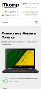 | AI-анализ | --- The website ITKOMP.BY offers laptop repair services in Minsk. The repair shop provides a guarantee of 120 days and offers free diagnostics. Customers can deliver their laptops to the service center or receive a consultation by phone at +375 (17) 351 50 69, +375 (44) 707 99 56, or +375 (29) 703 55 10. The address is ul. Very Khoruzhey 3. The website lists services for repairing laptops, computers, tablets, projectors, televisions, and promotional equipment. They also offer cleaning services for video cards and laptops. The website provides prices for various repair services, including laptop brands such as ASUS, Samsung, Apple, DELL, Acer |