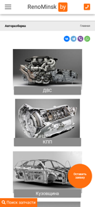 | AI-анализ | The website is an auto parts resale platform named RenoMinsk. It offers used auto parts for various makes and models, with a focus on providing delivery and warranty. The homepage consists of several sections including 'Garage' (presumably the main section for parts), 'Garanty i Dostavka' (Warranty and Delivery), 'Payment and Leasing' (for financial transactions), and 'Contacts'. The site's title is 'Авторазборка б/у запчастей' which translates to 'Used Auto Parts Resale'. The description meta tag includes the keyword 'запчасти' (parts) which appears frequently on the site along with other keywords like 'кпп' (transmission), '375' (Belarus country code), 'viber' and 'whatsapp' (communication apps |