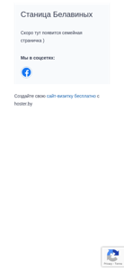 | AI-анализ | The portal Belavin.by is a future family website, as indicated by the title "Станица Белавиных" (Belavins' Station) and the description "Скоро тут появится семейная страничка" (A family page will soon appear here). The website offers users the opportunity to create a free site-visiting card through Hoster.by by filling out a form with required information such as name, email, and a message. The form includes fields for checking the correctness of the input, and users can submit their requests by clicking "Отправить" (Send). The website is registered under the .BY Belarusian domain. |