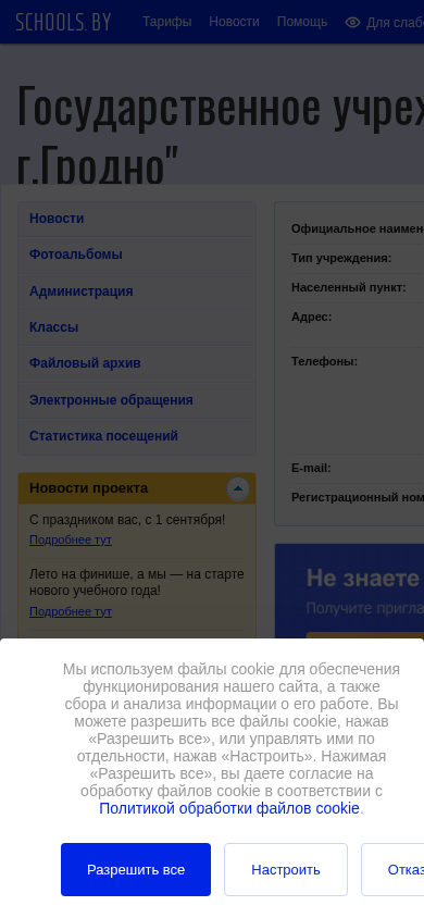 | AI-анализ | The website is a state educational institution called "Middle School No.12 in Grodno" with a dark color scheme and disabled images. It uses cookies for site operation and data collection. Visitors can allow or manage cookie settings through a pop-up banner. The site contains functional and statistical cookies. Functional cookies are mandatory for site functionality and cannot be disabled. Statistical cookies are set by third-party web analytics tools and can be used for data collection about visitors' interests, visited pages, and traffic sources, to evaluate and improve the site's performance. Visitors can opt-in to statistical cookies to allow the site to tailor their preferences and improve its functionality. The website's title is "Государственное учреждение образования "Средняя школа №12 г.Гродно"" and its domain is sch12grodno.schools.by |