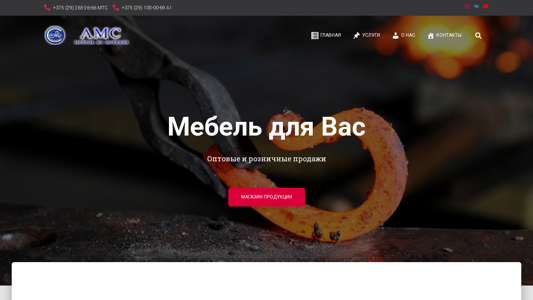 | AI-анализ | --- This online resource, titled "AMC — Производство мебели" (AMC — Furniture Production), is a Belarusian website that showcases and sells various types of furniture. The description mentions the availability of both retail and wholesale sales, as well as a shop section for their products. The website seems to pride itself on the quality of its goods, with a five-step quality check process, and offers customer support for any inquiries. The product range includes domestic furniture such as chairs and taborets, as well as garden furniture like tables and sets, and metal garden grills. The homepage features a "Find" search function and links to "Uslugi" (Services), "O nas" (About Us), and "Kontakty" (Contacts) sections. The use of Instagram, VK, and YouTube for communication is also mentioned, |