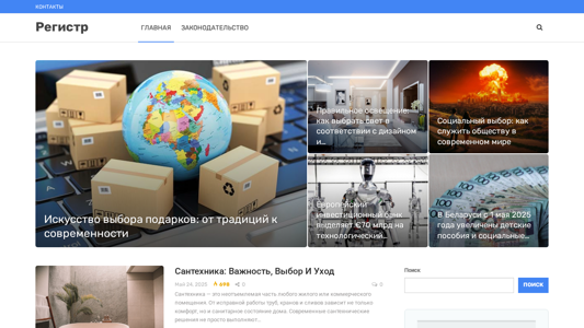 | AI-анализ | This online resource is a Belarusian domain name registration and information service. The title of the website is "registr.by" and it offers various categories and tags related to domain registration, post registration services, and legal information. Keywords associated with the website include "registr," "choice," "contacts," "more," and "rules." The top words on the website are "2025," "apr," "belarusi," "godas," "may," "doma," "all," "password," "contacts," "more," "gлавная," "legislation," "art," "choice," "gifts," "traditions," "modernity," "correct," and "licensing." The website appears to offer information and services related to domain registration, as well as legal and artistic content. There are several posts and categories related to sanitation, licensing |