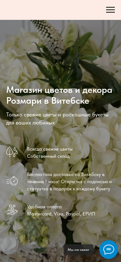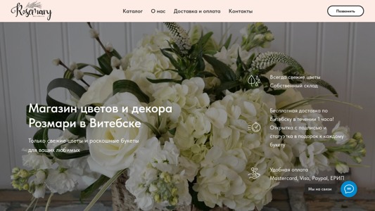 | AI-анализ | --- This website is an online flower and decoration store named "Розмари" (Rosemary) based in Vitsebsk, Belarus. The store offers a variety of fresh flowers and rosy bouquets for various occasions. They have their own storage facility and provide free delivery within Vitsebsk within an hour. Each bouquet comes with a greeting card and a small statuette as a gift. The store accepts payments through Mastercard, Visa, and Paypal. The website features different types and sizes of bouquets, baskets, and boxes, including sizable ones for weddings. Prices range from 100 rubles to 450 rubles. |