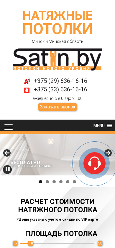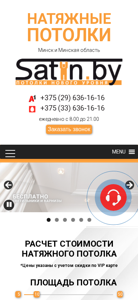 | AI-анализ | The web project 'Satin.by' is a Belarusian e-commerce site dedicated to selling various types of suspended and attached ceilings, including tiled, glossy, matte, satin, and cloth ones. The site offers a wide range of ceiling options for different types of buildings, such as houses, cottages, new constructions, offices, and apartments, including specific rooms like kitchens, bathrooms, and children's rooms. The company based in Minsk provides a phone number for orders and inquiries, with daily availability from 8 a.m. to 9 p.m. The site offers discounts and a catalog of popular lighting options, as well as various services like installation, repair, and removal. The site also features customer reviews and a pricing calculator. The product categories include different technologies like SLOTT, Eurokrab, and clipso, as |