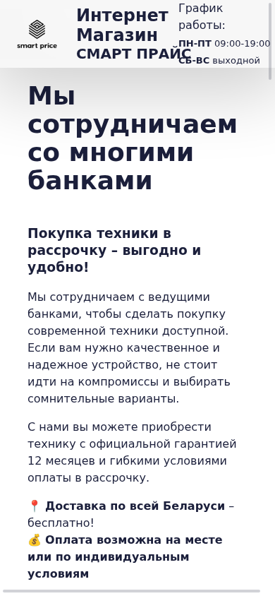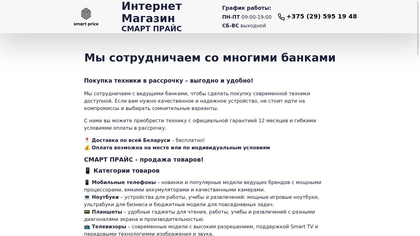 | AI-анализ | This website is an online store named Smart Prices, selling various electronics including mobile phones, laptops, tablets, televisions, headphones, and computer components. The store offers financing options through cooperation with multiple banks, allowing customers to purchase quality and reliable electronic devices with official warranties and flexible payment terms. Delivery is free across Belarus. Customers can pay in cash on site or arrange individual payment plans. The store carries popular brands and models with strong processors, large batteries, and high-quality cameras. Categories include mobile phones, laptops, tablets, televisions, headphones, and computer components. Customers can purchase electronics for full price or opt for financing. The website provides consultation and delivery services, with a contact number +375 (29) 595 19 48. |
