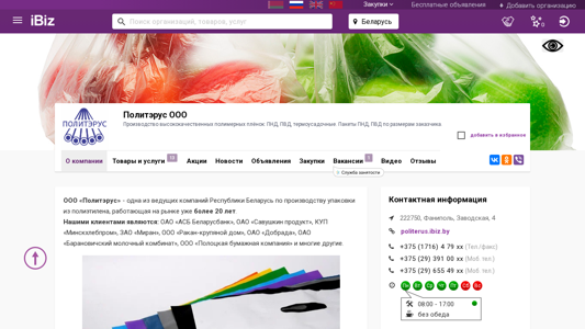 AI-анализ | --- The website <politerus.ibiz.by> is dedicated to Politerus OOO, a Belarusian company specializing in the production of high-quality polymer films: PND, PVD, and thermo-bonded types. Customized packages of PND and PVD are offered. The website provides a map for directions, contact numbers, and the address of Politerus OOO in Fanipol, Minskaya Oblast, Belarus. The company offers free classified listings for purchases. Politerus OOO is one of the leading Belarusian companies in packaging production, with over 20 years of experience on the market. Its clientele includes major enterprises such as OAO "ASB Belarusbank," OAO "Savushkinsky Product," KUP "Minskkhlebprom," |