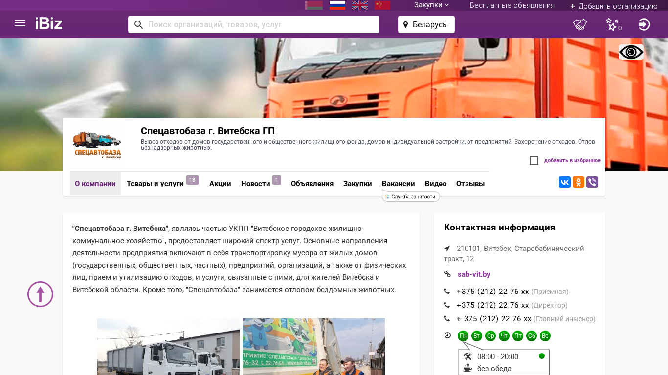 AI-анализ | The website "Sab-vit.ibiz.by" is a part of the State Urban Housing and Communal Services of Vitsebsk, providing a wide range of services. The main directions of the company's activities include the transportation of waste from residential buildings (state, public, private), organizations, and individuals. The company also accepts and utilizes waste, and offers related services for the residents of Vitsebsk and the Vitsebsk region. Additionally, Sab-vit engages in the capture and care of stray animals. Among the services provided are: * Handling solid municipal waste * Services for the capture and care of stray animals * Sorting of household waste * Renting out equipment The company operates a fleet of 83 units of machinery, including 54 garbage trucks, 15 tipper trucks, and other vehicles, as well as |