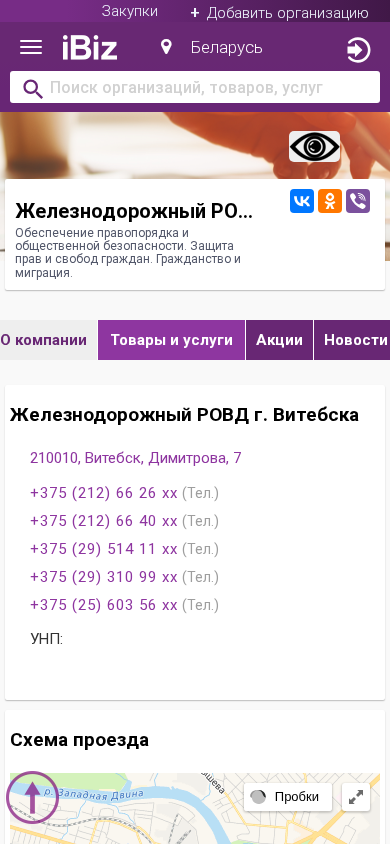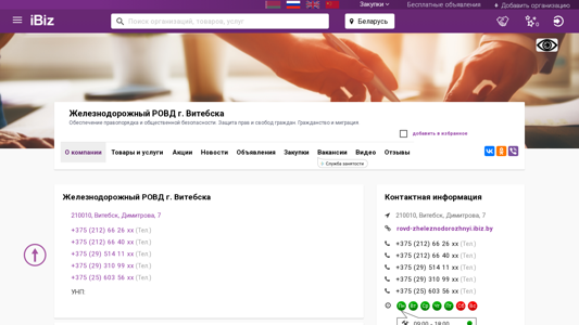 AI-анализ | The website is for the "Железнодорожный РОВД г. Витебска" (Railway Police Department of the city of Vitebsk, Belarus), providing information on the services and contacts of the department. The main topics covered on the site include the maintenance of law and order, protection of citizens' rights and freedoms, and issues related to citizenship and migration. The site includes a scheme of the way to reach the department, as well as its contact numbers. The website also features free classified ads under the categories of "Закупки" (purchases) and "iBiz search close" (business search). The domain name is "rovd-zheleznodorozhnyi.ibiz.by". |