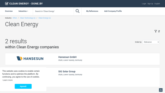 AI-анализ | language: en type: website seo_title: Clean Energy - Project References and Companies / done.by seo_description: On done.by companies of the 'Clean Energy' industries present their portfolio based on informative project references. seo_keywords: Clean Energy reference marketing, Clean Energy reference management, Clean Energy online marketing, Clean Energy case studies, Clean Energy verified references, Clean Energy B2B marketing, Clean Energy customer references, Clean Energy experiences, Clean Energy projects, Clean Energy freelancers, Clean Energy self-employed, Clean Energy service companies, Clean Energy solution providers, Clean Energy freelancers, Clean Energy customer references, Clean Energy catalog raisonné, Clean Energy impressions accessibility: - has-headings - has-lists - has-images - has-links - has-form-elements - has-keyboard-access - has |