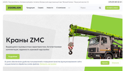 | AI-анализ | The website is the official site of OOO "ЗУМЛИОН БЕЛ-РУС", a Belarusian-Chinese joint venture. The site provides information on the features and pricing of ZMC 25, ZMC 40, and ZMC 60 cranes from the manufacturer, as well as contacts for service and dealership centers and an option to submit a purchase inquiry. Keywords related to cranes, heavy machinery, and the company's name are prevalent in the site's metadata. The company's location is in the Chinese-Belarusian Industrial Park "Великий Камень" in the Sмолевичsky district of Минская области, and contact information includes phone numbers for sales, service, and procurement departments, as well as a location address and operating hours. The site showcases the company's product line |