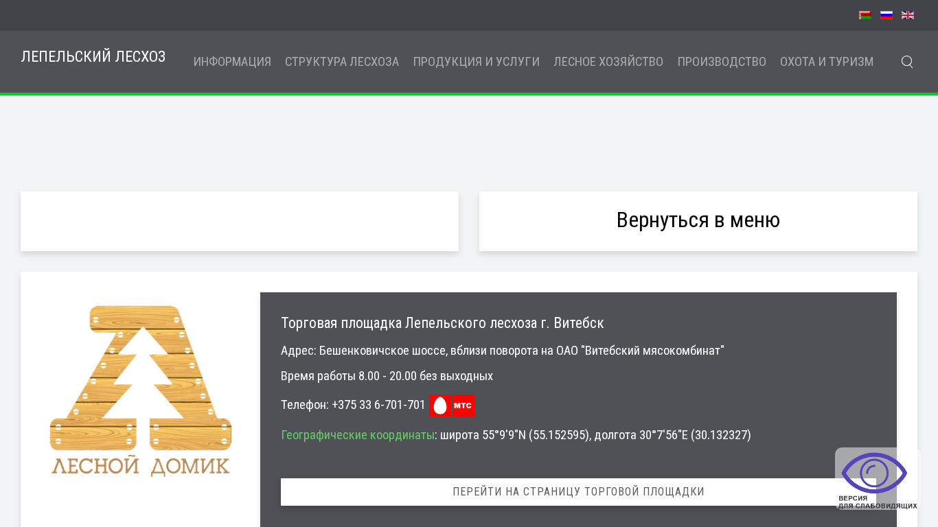 | SEO-описание | Государственное лесохозяйственное учреждение "Лепельский лесхоз" расположен в южной части Витебской области на территории Лепельского, Чашникского и Сенненского административных районов. Основные направления деятельности: ведение лесного хозяйства (охрана и защита леса, восстановление леса), лесозаготовка и лесопиление (переработка леса), ведение охотничьего хозяйства. |