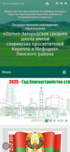 | AI-анализ | This online resource is a website for 'Погост-Загородская средняя школа имени славянских проsветителей Кирилла и Мефодия' (Kamen School) located in Pinsk District, Belarus. The website was updated on September 29, 2025 in Belarusian language. Keywords associated with the website include 'school', 'education', 'news', 'Pinsk district', 'Belarus', and various regional and ethnic terms. The most frequently used words on the website are 'подробнее' (more), 'сентября' (September), and 'день' (day), suggesting that the website may provide detailed information about the school and its events, possibly including a calendar of activities for the September day. The domain name is 'kamen.roo-pinsk.gov |