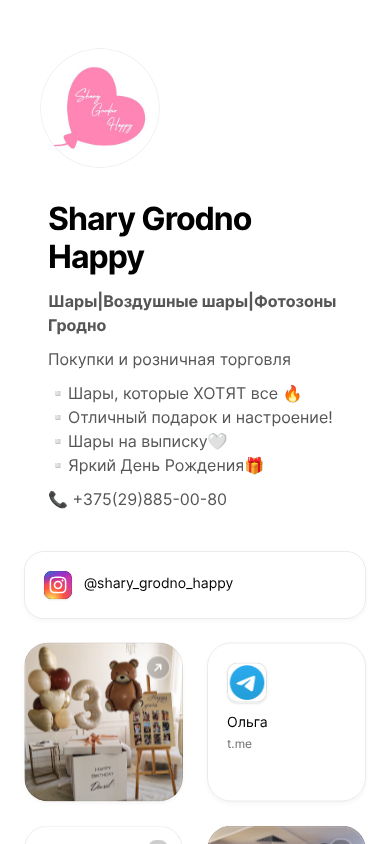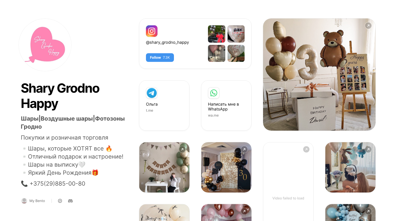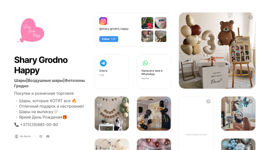 | AI-анализ | This website is titled "Shary Grodno Happy" and is associated with the .BY domain shary.by. The description includes keywords such as "shary," "grodno," "happy," "375," and "885-00-80." The top words, which indicate frequent occurrences, include "шары" (sharies, meaning balloons), "воздушные" (balloons, meaning inflatable), "фотозоны" (photo zones), "гродно" (Grodno, a city in Belarus), "покупки" (purchases), "розничная" (retail), and "торговля" (trade). The website likely offers the sale of balloons and related products in Grodno. The description also mentions "video failed to load" and includes social media links |