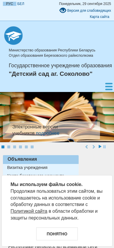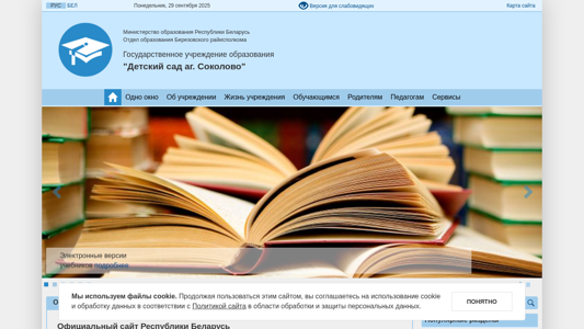 | AI-анализ | The website "Детский сад аг. Соколово" (Children's Garden of Agricultural Collective Soколово) is a government educational institution located in Belarus, as indicated by the .BY domain. The title and description suggest it is a kindergarten, and the keywords and top_words further confirm this. The website is operated by the Berezovsky rayon education department under the Ministry of Education of the Republic of Belarus. The site includes information on its administration, hours of operation, application procedures, and electronic submission of requests. Popular topics include news, education policies, and contact information. There are also sections for social-psychological services, safety guidelines, nutrition, and educational materials for parents. The site also features a gallery of photos and videos, and information on fees for services and various certifications. The structure of the site includes pages for the administration, pedagogical |