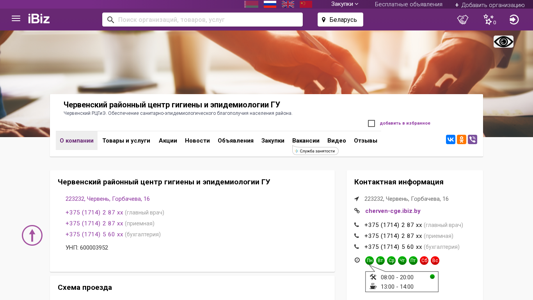 | AI-анализ | The portal is the Chervensky District Center for Hygiene and Epidemiology of the Chervensky Regional Public Health and Epidemiology Authority. It ensures the sanitary-epidemiological wellbeing of the district's population. The address and contact phone numbers for the center are provided. The website includes sections for company information, products and services, news, job vacancies, videos, and customer reviews. The center's opening hours are listed as Monday to Saturday from 8:00 to 20:00 with a lunch break from 13:00 to 14:00. The company is listed under the Sanepidmestanici category in Chervon, and also under Sanepidmestanici in general. |