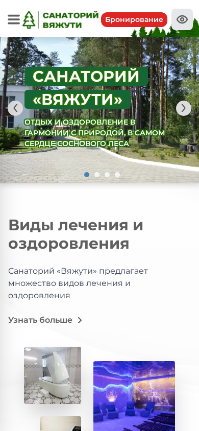 | AI-анализ | The portal "Sanatoriy Vyazuti" offers health rest in a Belarusian sanatorium with a wide range of therapeutic programs, experienced doctors, and modern equipment. The sanatorium is located in the heart of a pine forest. The website provides information about accommodations, doctors, treatments, infrastructure, obligations, news, and contacts. The available rooms include one and two-person single-room and two-room options, with various sizes and layouts. The site also offers information on prices, payment methods, and services. The latest news includes ongoing improvements to the sanatorium's territory and the exhibition of an artist's work. |