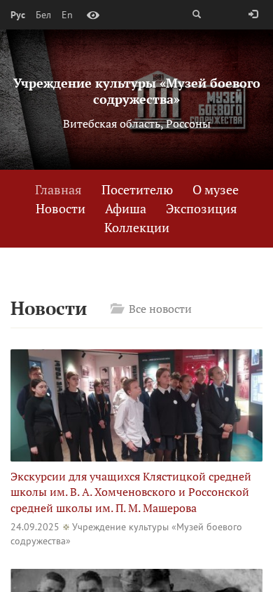 | AI-анализ | --- The website "Museum of Combat Camaraderie" is a cultural institution dedicated to providing news, event schedules, visitor information, pricing, exhibits, collections, and resources for museum professionals. The museum is located in the town of Rossony in the Vitsebsk region of Belarus. The site includes information on various events, such as school field trips, exhibitions, and autotours, along with contact details and hours of operation. The site also features social media links and a contact email for inquiries. The museum's address, phone numbers, and hours of operation are as follows: 211471, Vitsebsk region, Rossony, Sovetskaya ul., 10a; +375 (2159) 5-20-49, +375 (2159) 5- |