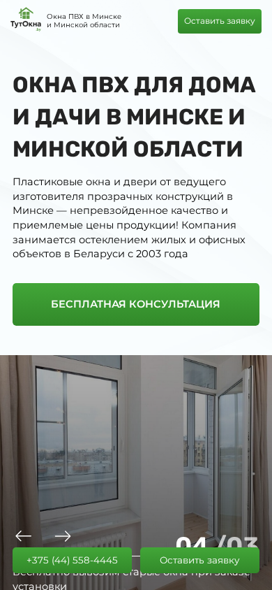 | AI-анализ | This online resource, titled "TutOkna," is a website dedicated to selling PVC windows and doors in Minsk and the Mininsky region of Belarus. The company, which has been operating since 2003, offers high-quality PVC windows and doors with competitive prices. The website provides information about the location of the store in Minsk and its operating hours, which are seven days a week from 9:00 to 21:00 without any holidays. Customers can leave a request for a quote or place an order by calling the phone number +375 (44) 558-4445. The website features various types of windows with different configurations and offers discounts of up to 30% for multiple purchases. The company uses Brusbox profiles, Kale fittings, and 32mm glass packs for its windows |