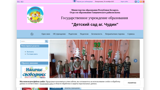 | AI-анализ | This website, titled "Детский сад №16 д. Чудин" (Children's Garden No. 16 d. Chudin), uses cookies and is operated in Belarusian language. The most frequent keywords include "детский сад" (children's garden), "Чудин" and "сад" (garden), as well as "новости" (news), "объявления" (announcements), and "учреждениях" (institutions). The description also mentions "Беларусь" (Belarus) and "республики" (republic). The top words are "2025", "читать" (to read), "далее" (further), "образования" (education), "крэольская" (creole), and "ла |
