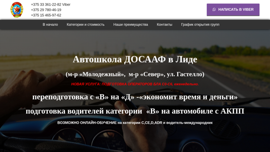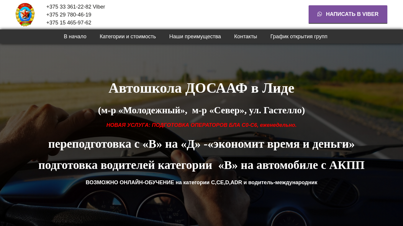 | SEO-описание | Автошкола ДОСААФ в г. Лида- м-р Молодежный,- Север- подготовка водителей- категории В-, С, -СЕ,- Д, -экзамен ГАИ-, водитель международник-, ADR-, фура-, ДОСААФ Лида.- категория В в Березовке |