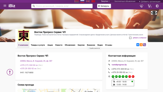 | AI-анализ | This online resource is a business consulting firm offering various services related to China. The company, Восток Прогресс Сервис ЧП, is located in Минск, Belarus, at the address В. Хоружей, 29, оф. 007. Their services include translations, finding business partners in China, checking companies, dealing facilitation, legal services, business visits to China, and tourist services. They can be reached at the phone numbers +375 (17) 334 04 xx and +375 29 353 02 xx. The Unified State Register of Enterprises number for this organization is 192718850. The website provides a map for directions and business hours are from 9:00 to 18:00 on weekdays and weekends |