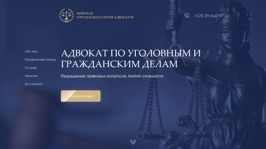 | AI-анализ | --- The website is that of advocate Natallia Chirok. She has been practicing law for over 20 years and is a member of the Minsk City Bar Association. The website provides information about her legal services, which cover both criminal and civil cases. She holds a license issued by the Ministry of Justice of Belarus to practice law, dating back to 1993. The website includes sections for contact information, pricing, and details on the types of legal help available for criminal and civil cases. This includes representation at various stages of criminal proceedings, such as during preliminary investigations, trials, and appeals. The site also offers consultations and document preparation for civil cases. The domain is advokat-natalliachyrok.by. |