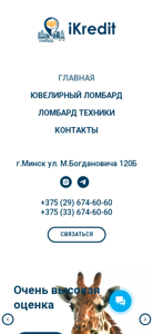 | AI-анализ | --- The web project iKredit.by is a universal loan and appraisal service based in Minsk, Belarus. It offers the highest appraisal rates and the lowest interest rates starting from 0.3%. The website provides online appraisal services for various items including jewellery, electronics, and building tools. It also offers insurance for loans and guarantees confidentiality. The project has a user-friendly interface with clear instructions for the appraisal process, and users can contact the company through two phone numbers provided on the site. The site includes testimonials from satisfied clients praising the quick and professional service, and the user-friendly appraisal form allows users to input the type, condition, and weight of the item they wish to appraise, along with their name and contact information. The website also offers a loan service for jewellery, with the possibility of receiving up to 9 |