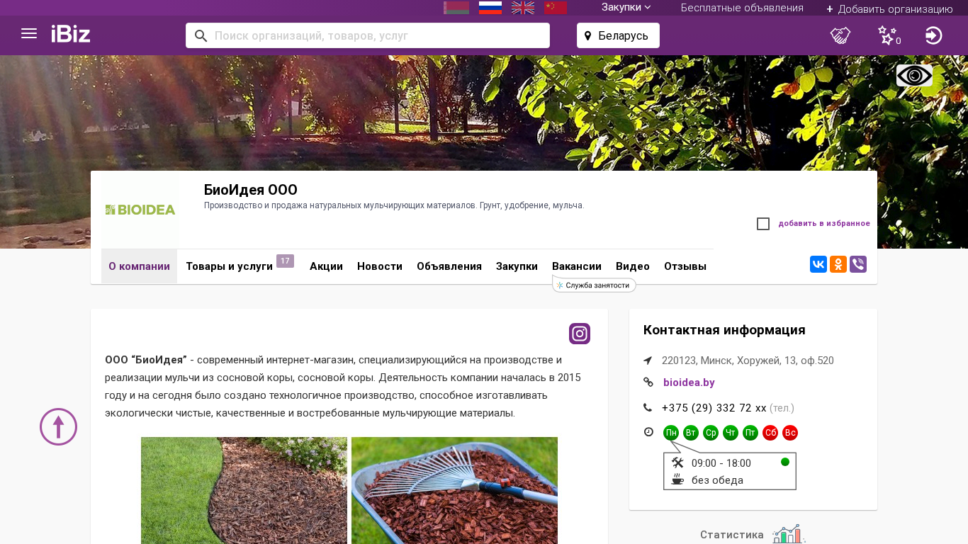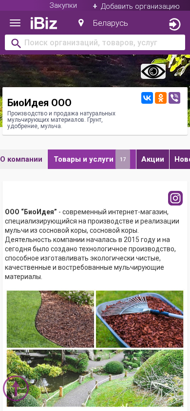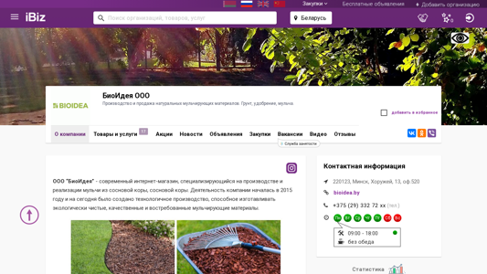 AI-анализ | The website is for BioIdea OOO, a company based in Minsk, Belarus, specializing in the production and sale of natural mulching materials, including soil, fertilizer, and mulch. The company's address is at Horuzhey 13, office 520. The website provides information on the company's products, which include mulch made from pine bark in small and large fractions, pine bark, and pine bark waste. The company uses mulch to protect and cover the soil from weather conditions and harmful microorganisms, and it also helps retain moisture and improve soil aeration. The primary clients for BioIdea OOO are companies in the gardening, landscaping, and landscaping industries. The website includes a map for visiting the company, contact information, and operating hours, which are from 9:00 AM to 6:0 |