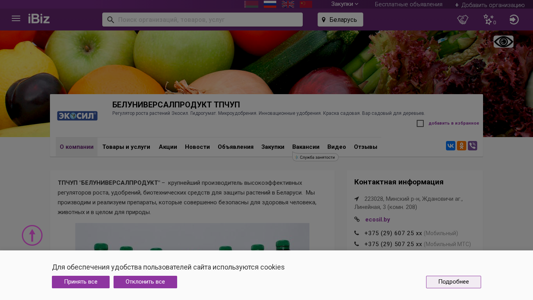 | AI-анализ | The web project "БЕЛУНИВЕРСАЛПРОДУКТ ТПЧУП" specializes in producing and selling plant growth regulators, hydrogumat, microfertilizers, innovative fertilizers, garden paint, and warming solution for trees in Belarus. The organization's address is 223028, , Ждановичи аг., Линейная, 3 (комн. 208). They offer a range of products that are safe for human health, animals, and the environment, utilizing proven recipes with harmless ingredients and advanced technologies. The company's mission is to create optimal formulas for plants that are both effective and natural, resulting in eco-friendly products. The product line includes natural plant growth regulators, microfertilizers with growth stimulators, humic fertilizers, fun |