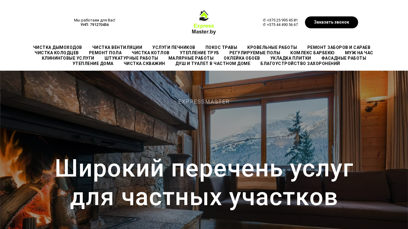 | AI-анализ | --- The website Expressmaster.by offers a wide range of services for private plots. These include cleaning of chimneys, boilers, ventilation in cafes and bars, as well as in production rooms and apartments. Additionally, they provide services for landscaping. This includes lawn mowing, land cleaning, repair and installation of fences and sheds. Roof repair, complex roofing works of any complexity. Floor repair. Cleaning of boilers, insulation of pipes, installation of regulated floors, and complex barbecue systems. A man for hire and cleaning services. Stucco work, painting, wallpaper hanging, tile laying, facade work, and home insulation. Cleaning of wells and private bathrooms. Landscaping of cemeteries. They work throughout Belarus and Russia, and also with legal entities. |