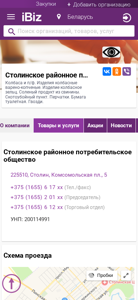 | AI-анализ | The website is a consumer cooperative named 'Stolinskoe rayonnoe poтребительское obshchestvo - Kolbasa i p/f' located in Stolin, Belarus, with the address at Komsomoskaya pl. 5. The cooperative specializes in the production and sale of various types of sausages and salted meat products made of pork, as well as other items such as gloves, toilet paper, and nails. The website includes contact information, including phone numbers and a map for visitors. The business registration number is 200114991. The cooperative's opening hours are from 9:00 to 18:00 every day, except for weekends when it is closed. The website is hosted on the iBiz.by platform. |
